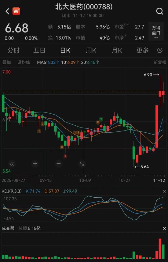Wind数据显示,截至11月12日收盘,北大医药股价报6.68元/股,市值为40亿元。